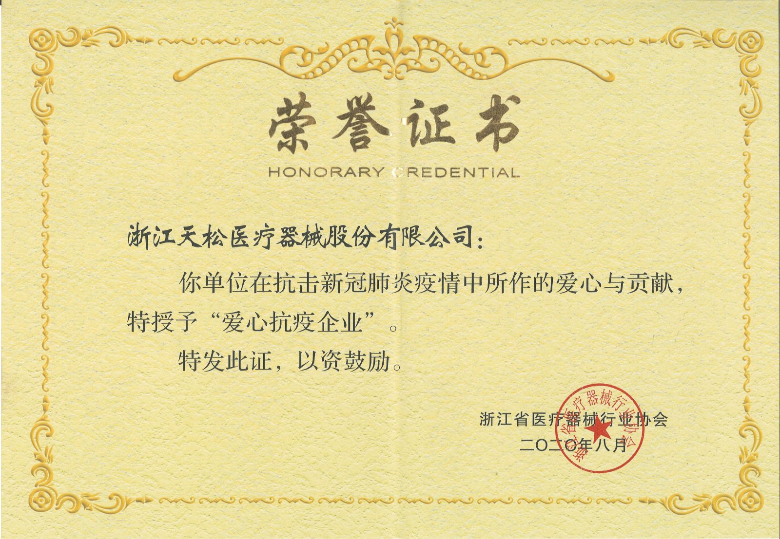 “天災(zāi)無情人有情” 為了表彰在抗疫期間作出突出貢獻的醫(yī)療器械企業(yè),浙江省醫(yī)療器械行業(yè)協(xié)會舉辦了“愛心抗疫企業(yè)” 表彰大會。天松醫(yī)療獲“愛心抗疫企業(yè)”榮譽。公司總經(jīng)理徐斌頂出席了表彰大會。